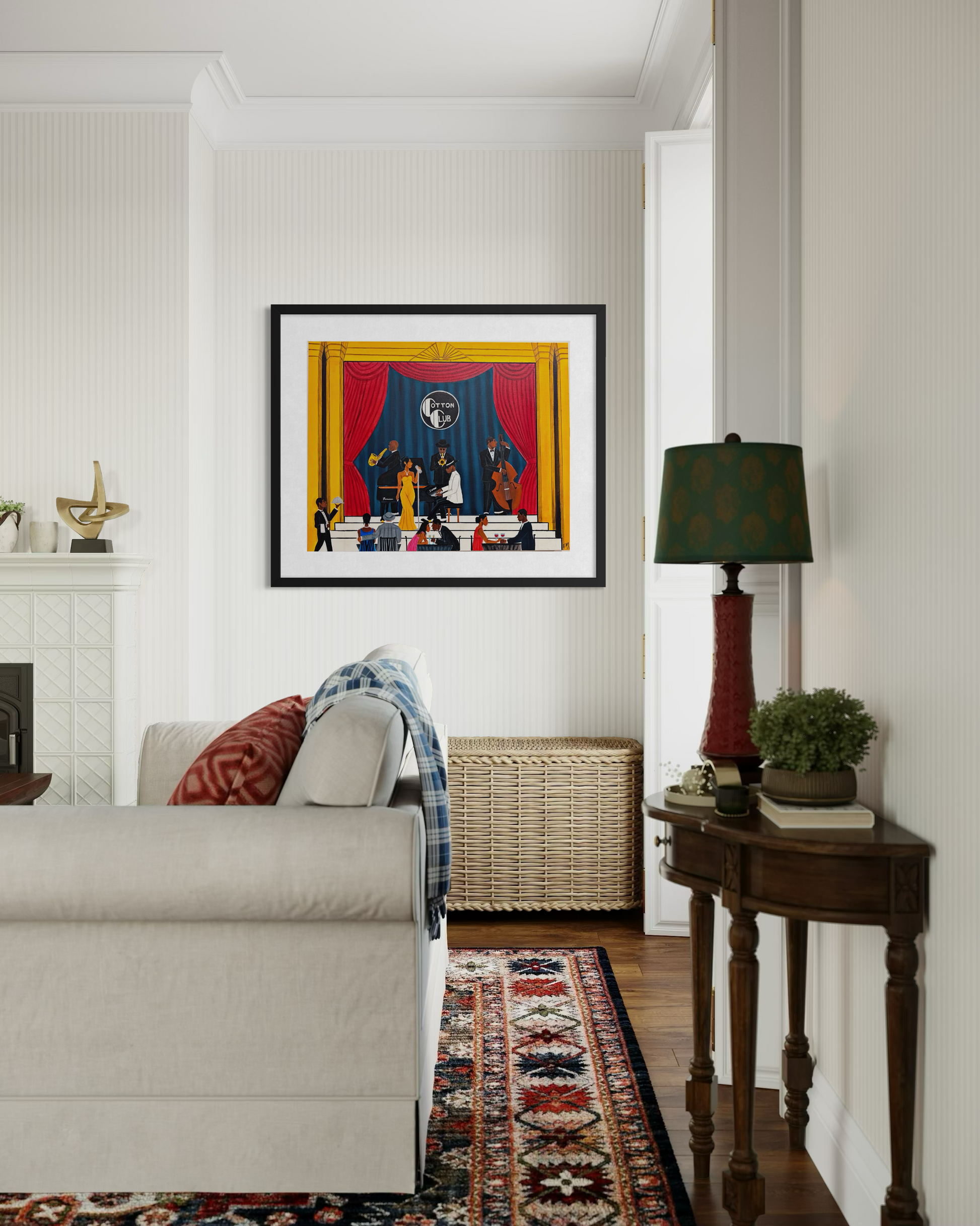 Golden columns and velvet curtains frame a stage alive with Black brilliance: a jazz ensemble in full swing, a radiant vocalist in yellow, and an audience dressed to impress. But beyond the glamour lies a deeper story Black artists were celebrated on stage, yet often excluded from the very rooms they lit up.