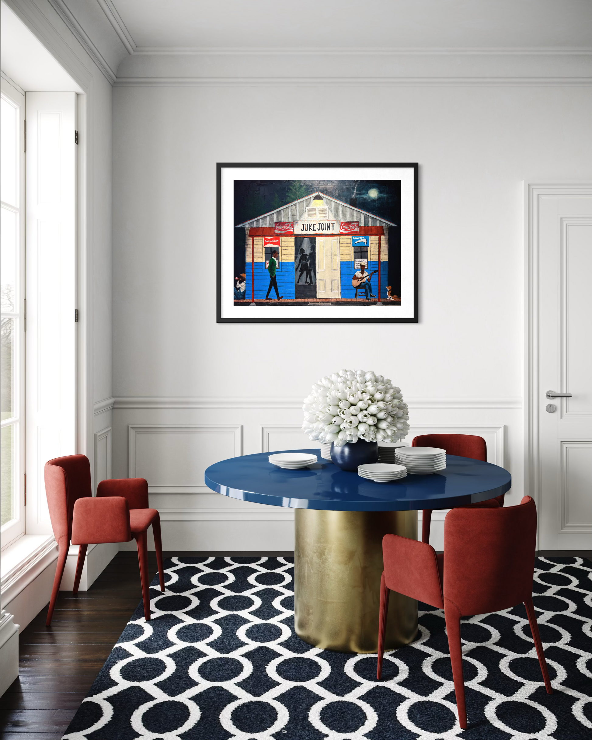 Every detail—Coca‑Cola signs, the handwritten menu, the man in overalls taking a slow drink—grounds the painting in the lived reality of Black communities who carved out spaces of freedom and expression despite the weight of the world outside. The juke joint becomes more than a building; it is a sanctuary of sound, fellowship, and release.