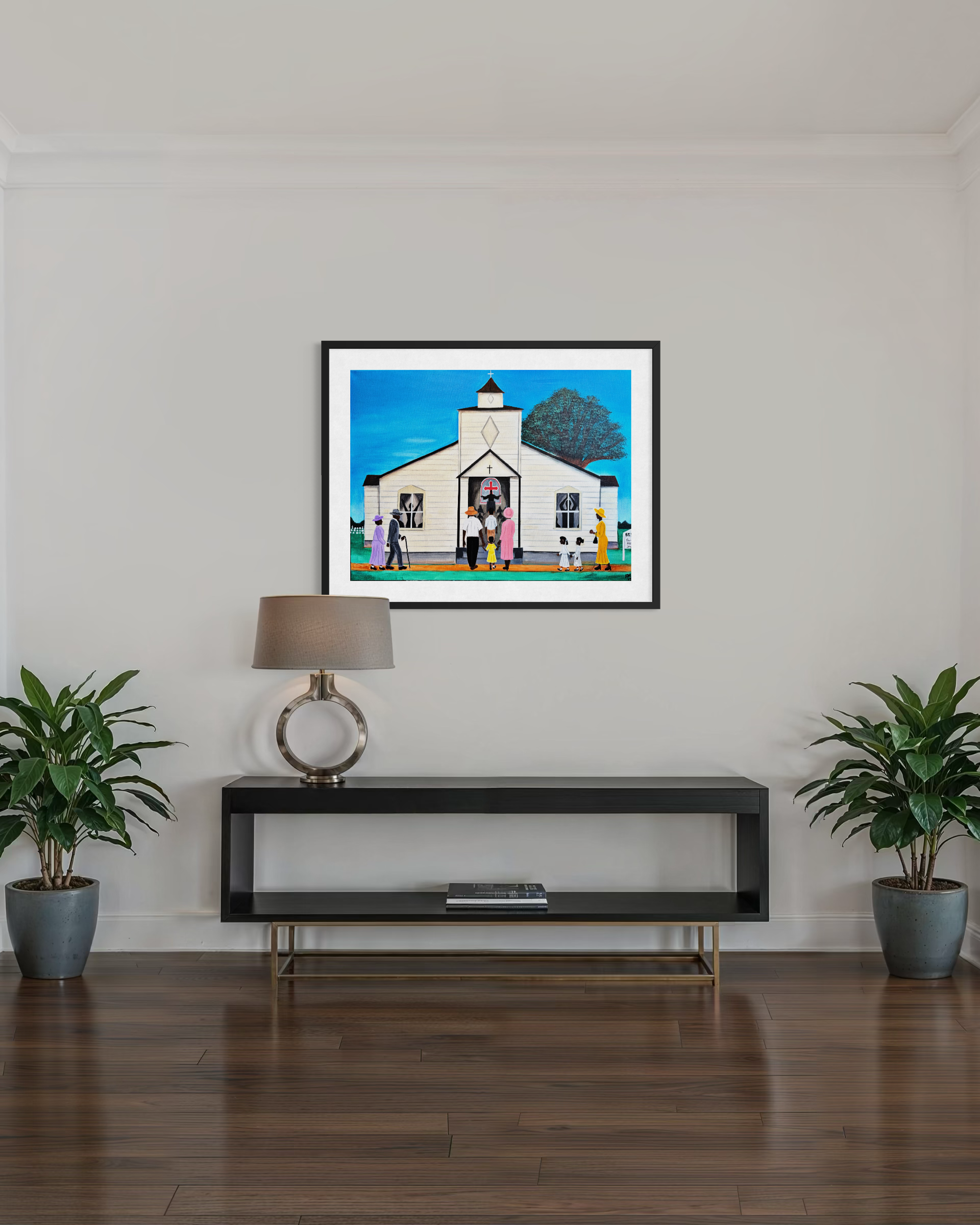 This painting captures a sacred moment of gathering—a Sunday morning scene where faith, family, and community converge beneath Southern skies. Families approach a modest white church, dressed in their finest, embodying reverence and dignity. The preacher stands inside, framed by a red cross, ready to deliver a message of hope and endurance.